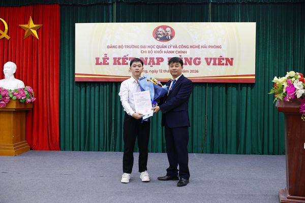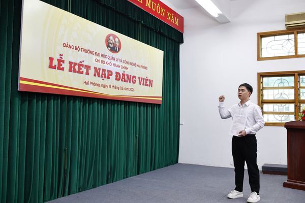 Chiều ngày 12/02/2026, trong không khí trang nghiêm và đầy tự hào tại Hội trường F301, Đảng bộ Trường Đại học Quản lý và Công nghệ Hải Phòng đã long trọng tổ chức Lễ kết nạp Đảng viên mới cho hai quần chúng ưu tú: đồng chí Trần Đình Quý và đồng chí Phạm Thế Duyệt. Đây là sự kiện chính trị quan trọng, đánh dấu bước phát triển mới trong công tác xây dựng Đảng và phát triển đội ngũ "hạt giống đỏ" của Nhà trường.