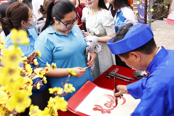 Điểm nhấn đặc biệt của chương trình là khu vực ông đồ cho chữ – nơi đông đảo sinh viên dừng chân xin chữ đầu năm như “Thành công”, “May mắn”, “Bứt phá”… Mỗi nét chữ không chỉ mang ý nghĩa cầu chúc tốt đẹp mà còn gửi gắm kỳ vọng và quyết tâm cho một năm học mới nhiều thành tựu.