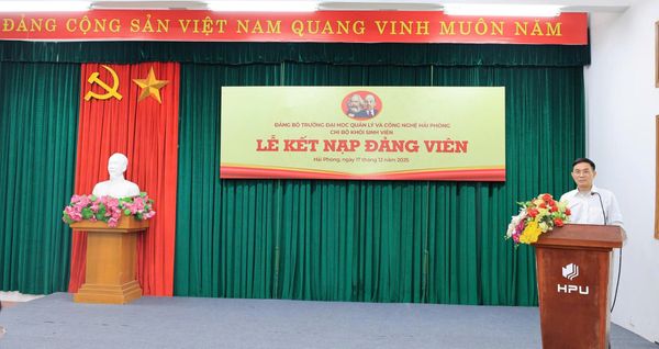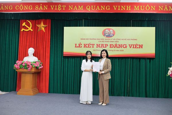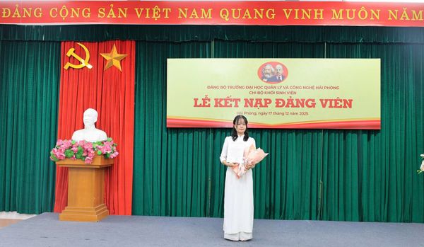 Chiều thứ Tư, ngày 17/12/2025, Chi bộ Khối sinh viên thuộc Đảng bộ Trường Đại học Quản lý và Công nghệ Hải Phòng đã long trọng tổ chức Lễ kết nạp Đảng viên cho sinh viên ưu tú Nguyễn Thị Thu Huyền – sinh viên chuyên ngành Ngôn ngữ Anh Trung, khóa 27. Buổi lễ diễn ra trong không khí trang nghiêm, đúng trình tự, thủ tục theo quy định của Điều lệ Đảng Cộng sản Việt Nam.