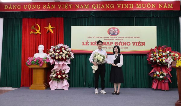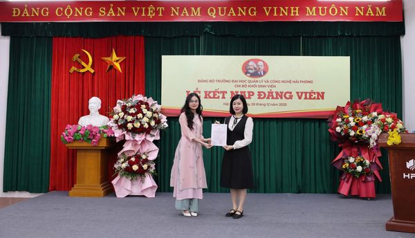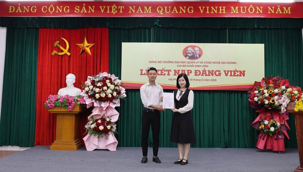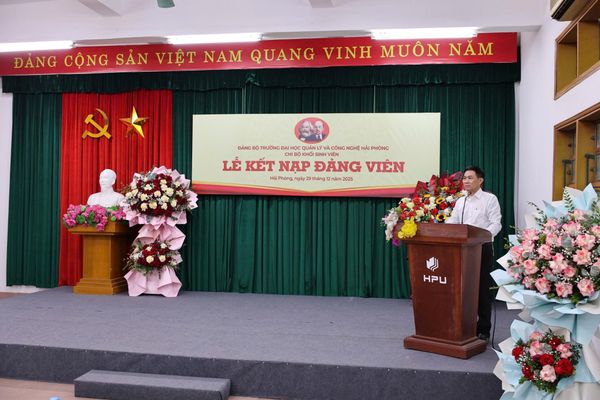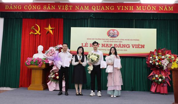 Chiều ngày 29/12/2025, chi bộ Khối sinh viên, Đảng bộ Trường Đại học Quản lý và Công nghệ Hải Phòng đã long trọng tổ chức Lễ kết nạp Đảng viên cho sinh viên tại hội trường nhà trường. Đây là sự kiện chính trị có ý nghĩa quan trọng, thể hiện sự quan tâm sâu sắc của Đảng ủy Nhà trường trong công tác xây dựng Đảng, đặc biệt là công tác phát triển Đảng viên trong sinh viên.